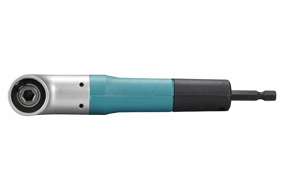 Makita right angle attachment with 1/4" hex shank for impact driver and drills. Features a compact design ideal for working in tight spaces, installing cabinets, kitchens, and other hard-to-reach areas