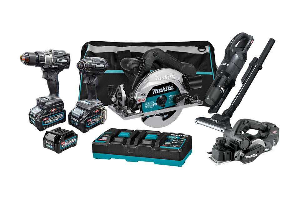 2 x 40Vmax 4.0Ah Batteries (BL4040), 1x 40Vmax 2.5Ah Battery (BL4025) and 40Vmax Dual Rapid Charger (DC40RB) and Tool bag