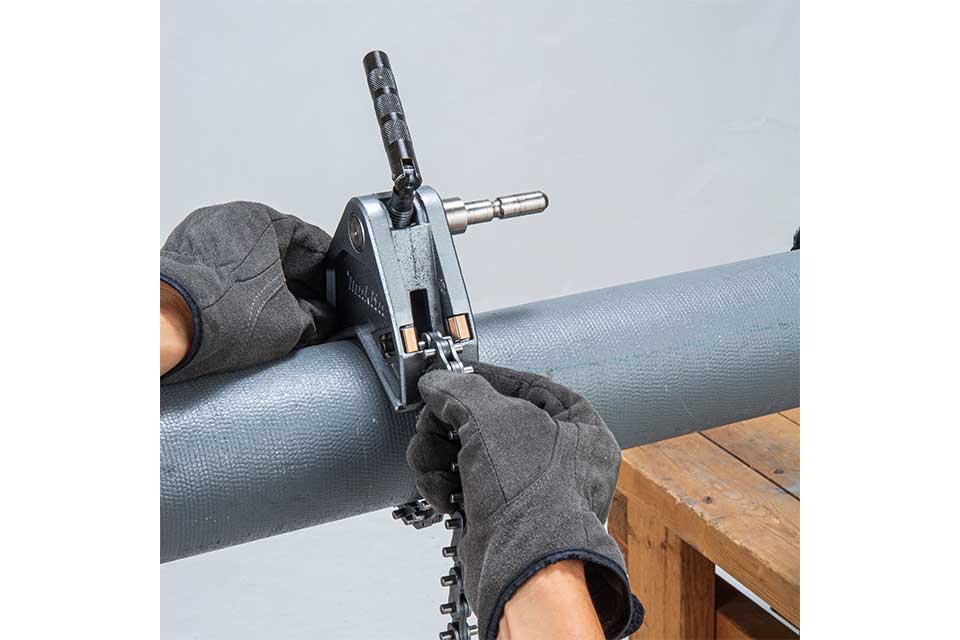- The chain vise features a robust design with a chain mechanism that securely clamps pipes during cutting. With a capacity for outside diameters up to 220mm, it accommodates a wide range or pipe sizes used in plumbing, engineering and other construction trades