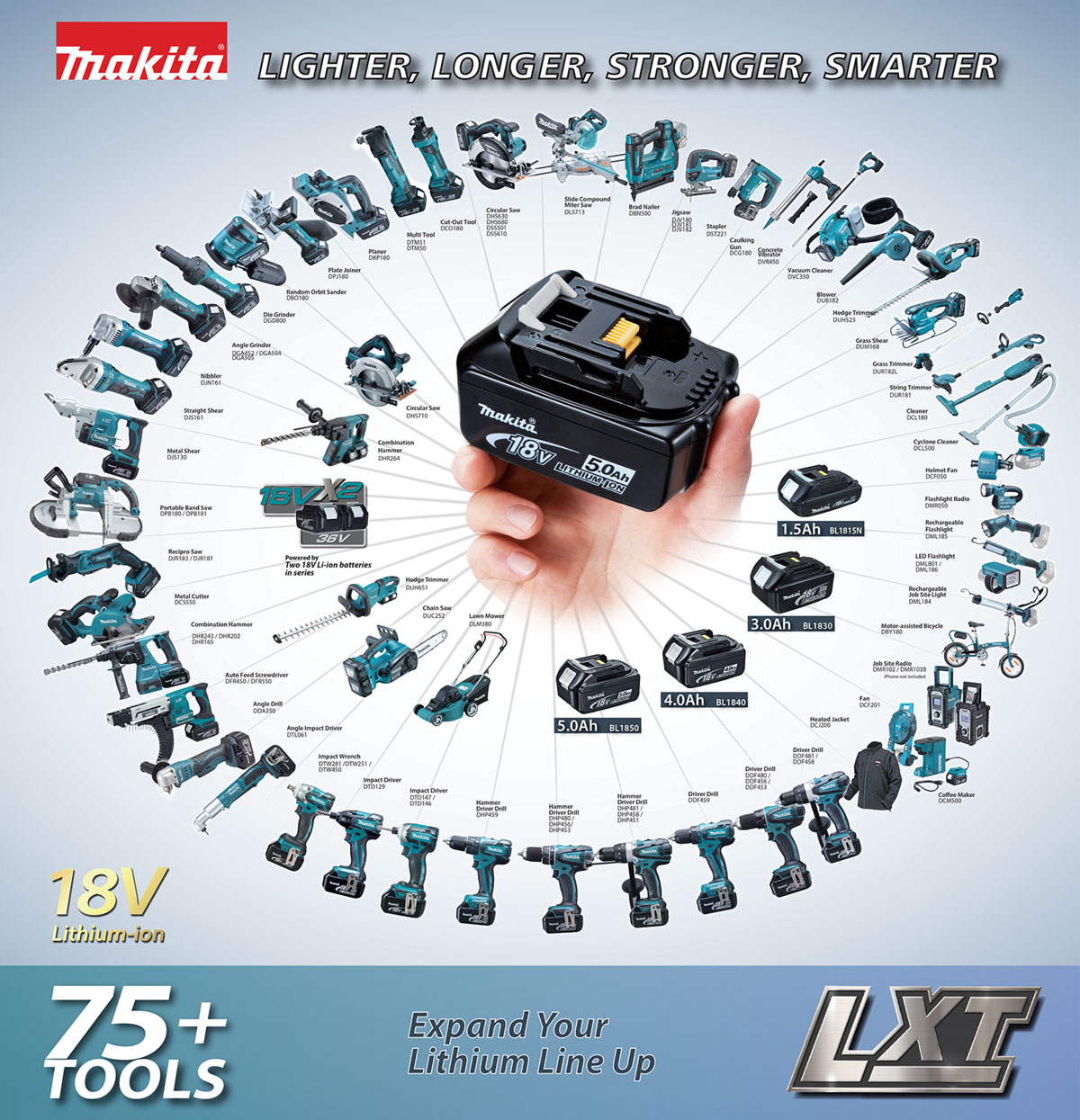 Makita offers 75+ LXT tools with solutions for trades from concrete to construction, electrical to landscaping, and they’re all powered by one powerful, fast-charging 18V Lithium-Ion battery.